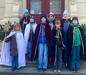Auch acht Schüler und Schülerinnen unserer Schule nutzen den letzten Tag der Weihnachtsferien, um in königliche Gewänder zu schlüpfen. Sie beteiligten sich an der diesjährigen Sternsingeraktion „Schule statt Fabrik – Sternsingen gegen Kinderarbeit“. Dafür waren sie in 3 Gruppen mit Kindern der katholischen Pfarrei St. Elisabeth in Ballenstedt unterwegs. Diese hatte bei unserer Religionslehrerin angefragt, um alle Besuchswünsche erfüllen zu können. So besuchten die Sternsinger ältere Menschen, soziale Einrichtungen und brachten den Segen auch in die Stadtverwaltung. Dabei machten sie zugleich auf das wichtige Anliegen aufmerksam, dass Kinder weltweit ein Recht auf Bildung haben.